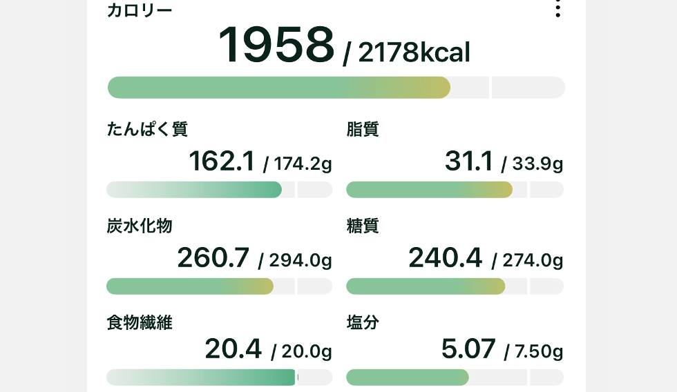 - 一日合計:1975kcal / P165.7g / F30.4g / C260g